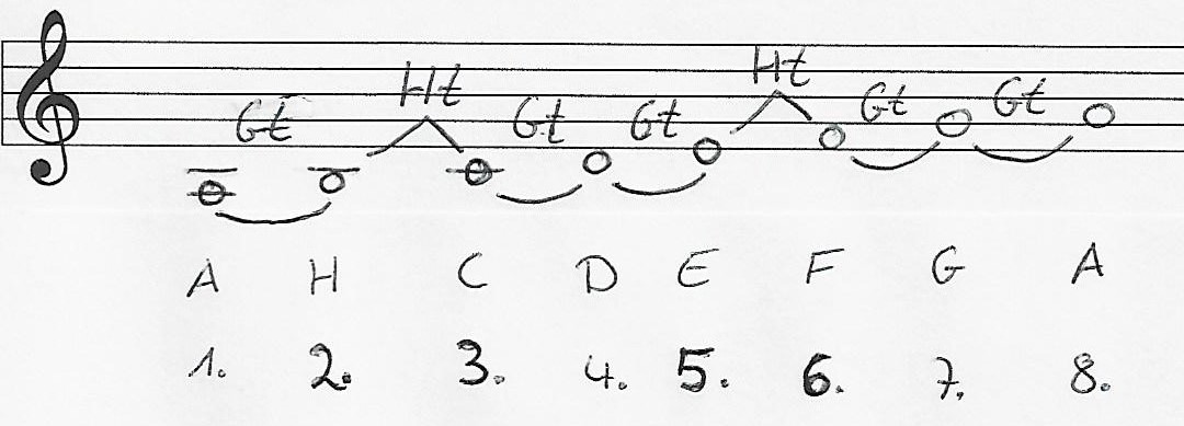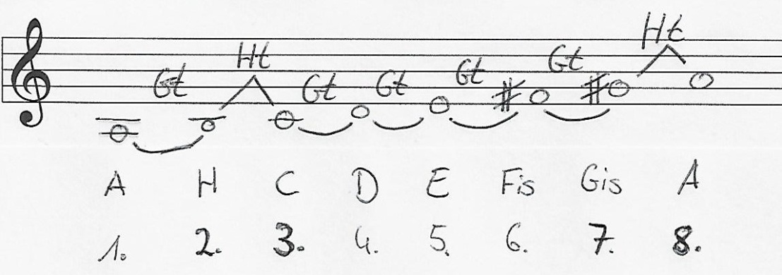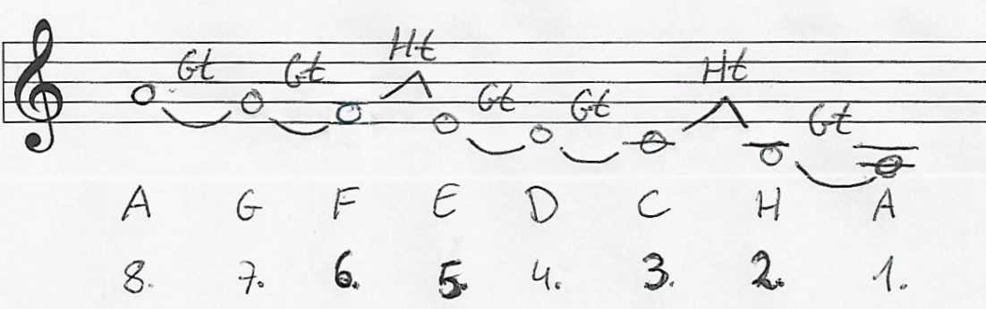 Abbildung 3: reines Moll - Platzierung der Halb (Ht)- und Ganztonschritte (Gt) im Notensystem