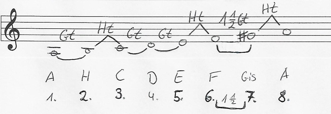 Abbildung 4: harmoisch-Moll - Platzierung der Halb (Ht)- und Ganztonschritte (Gt) im Notensystem