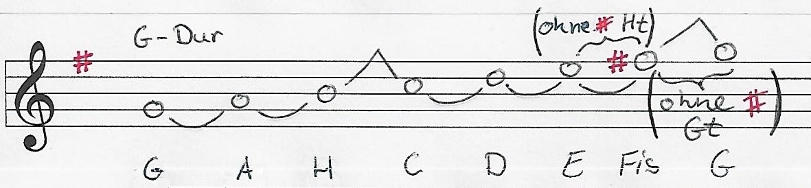 Im Falle der G-Dur-Tonleiter liegen mit dem Fis bereits alle Halb- und Ganztonschritte richtig, weshalb G-Dur kein weiteres Kreuz bekommt.