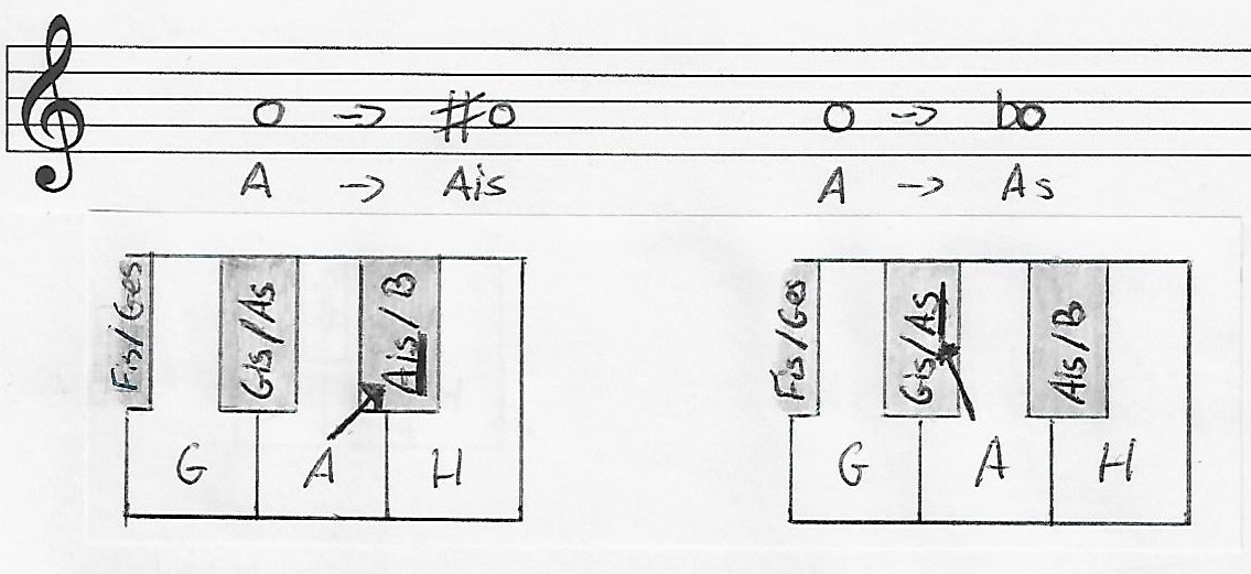 Das b (♭) auch Be genannt, erniedrigt einen gewünschten Ton einen Halbtonschritt (lässt ihn tiefer klingen) à Der Ton A wird mit b (♭) davor zu As. Hier funktioniert die Verschiebung ebenfalls mit jedem beliebigen Ton. Also wird der Ton G wird mit einem b (♭) davor zum Ton Ges.